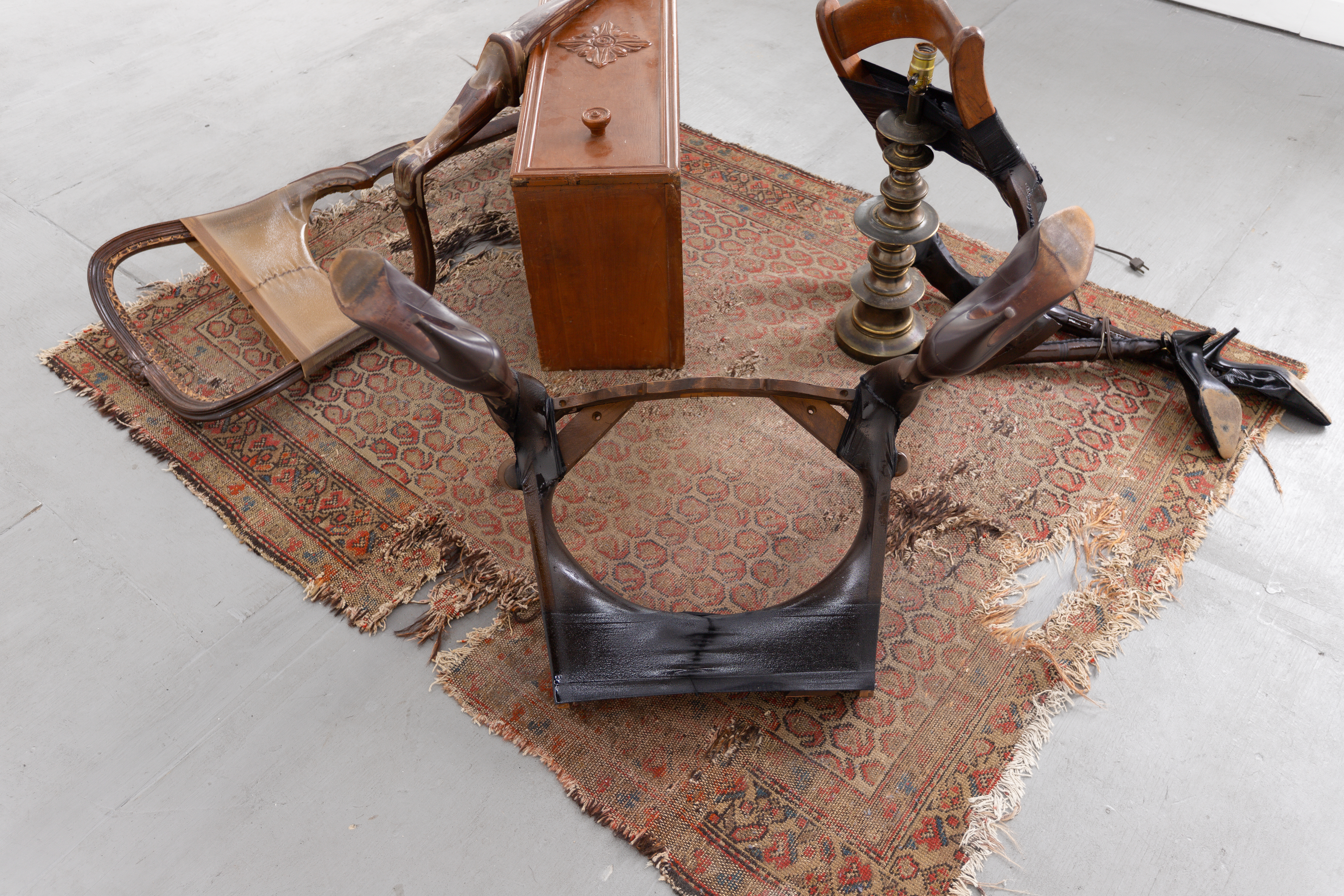 Clumsy Peggy, 2025, Chair, duct tape, resin, stockings, shoes, lamp
