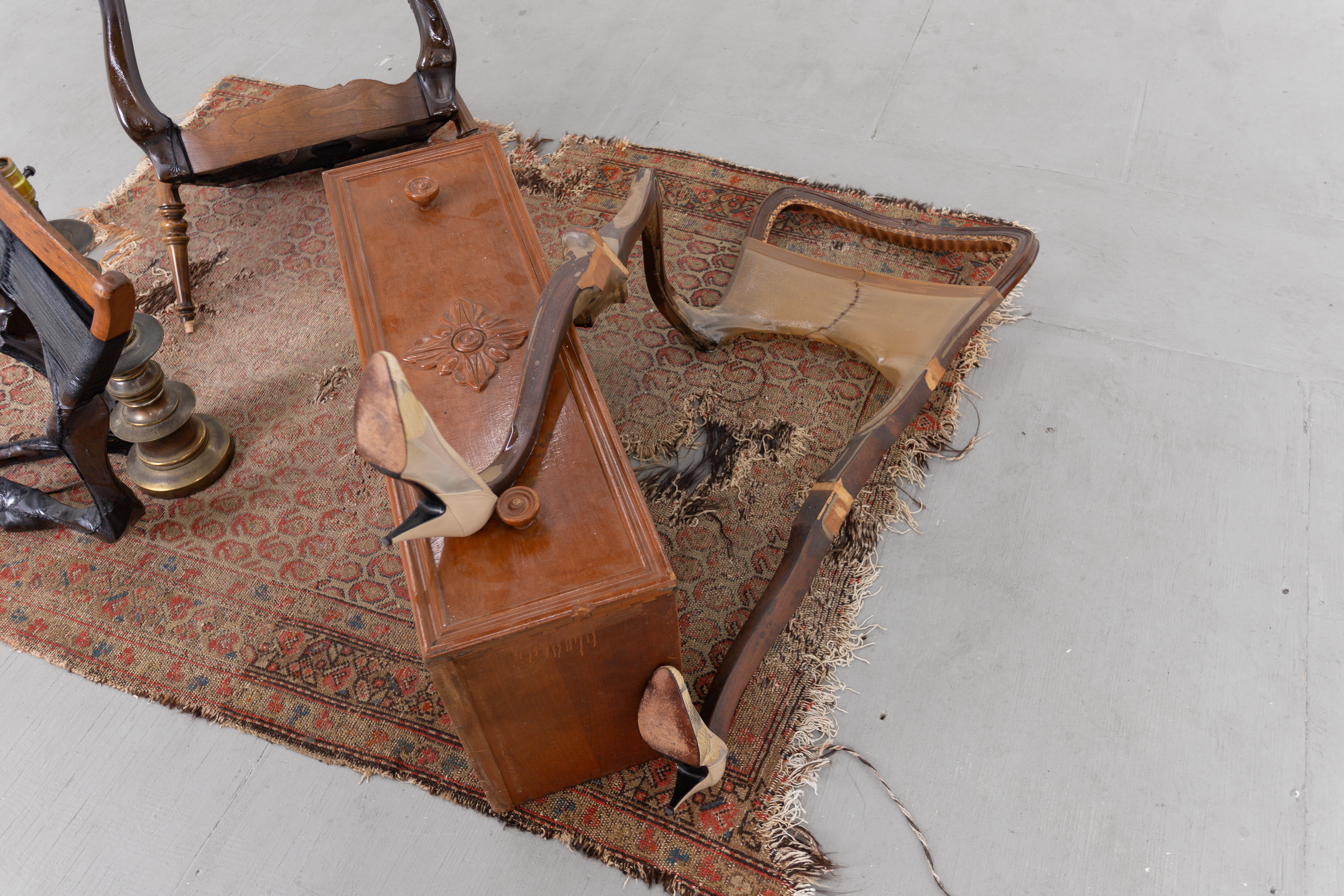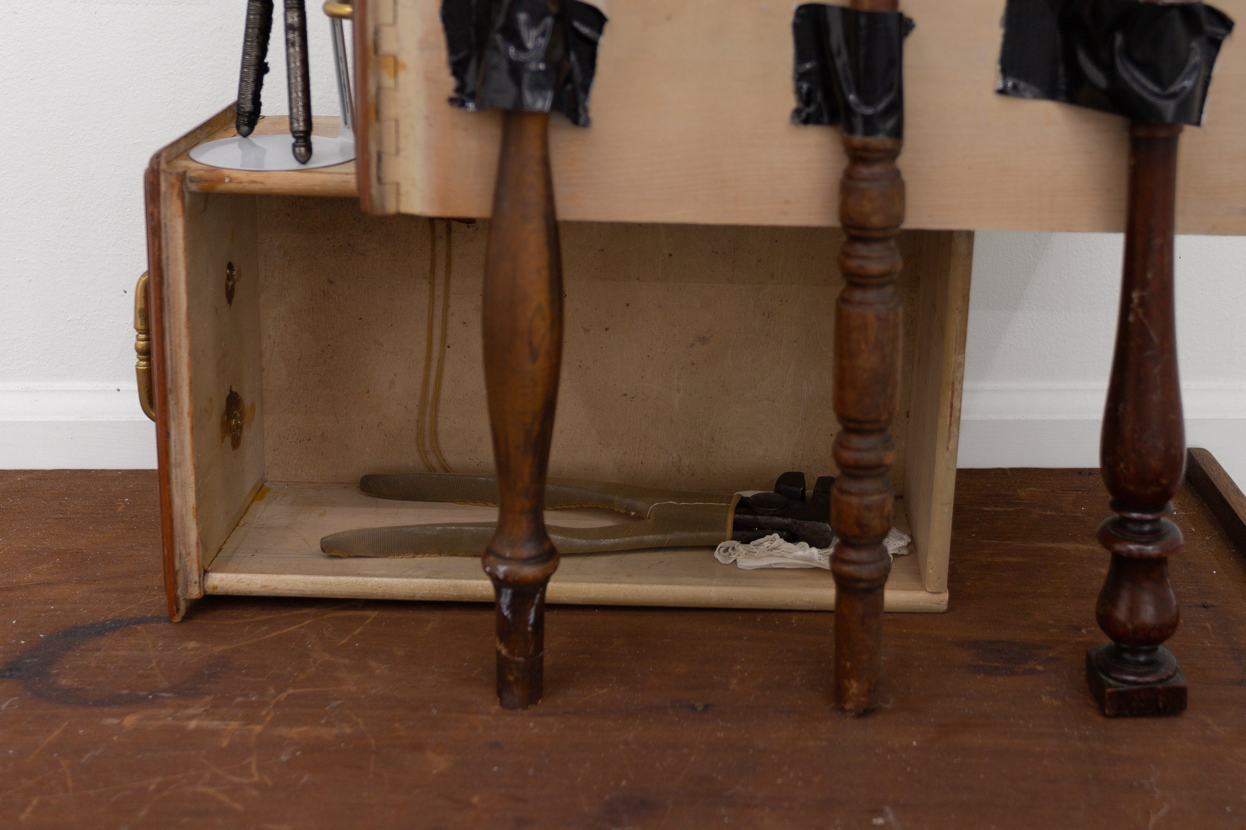 Madame’s bed, 2025, Drawers, balusters, duct tape, nutcracker, wrench, stockings, thread, doll stand, doily
