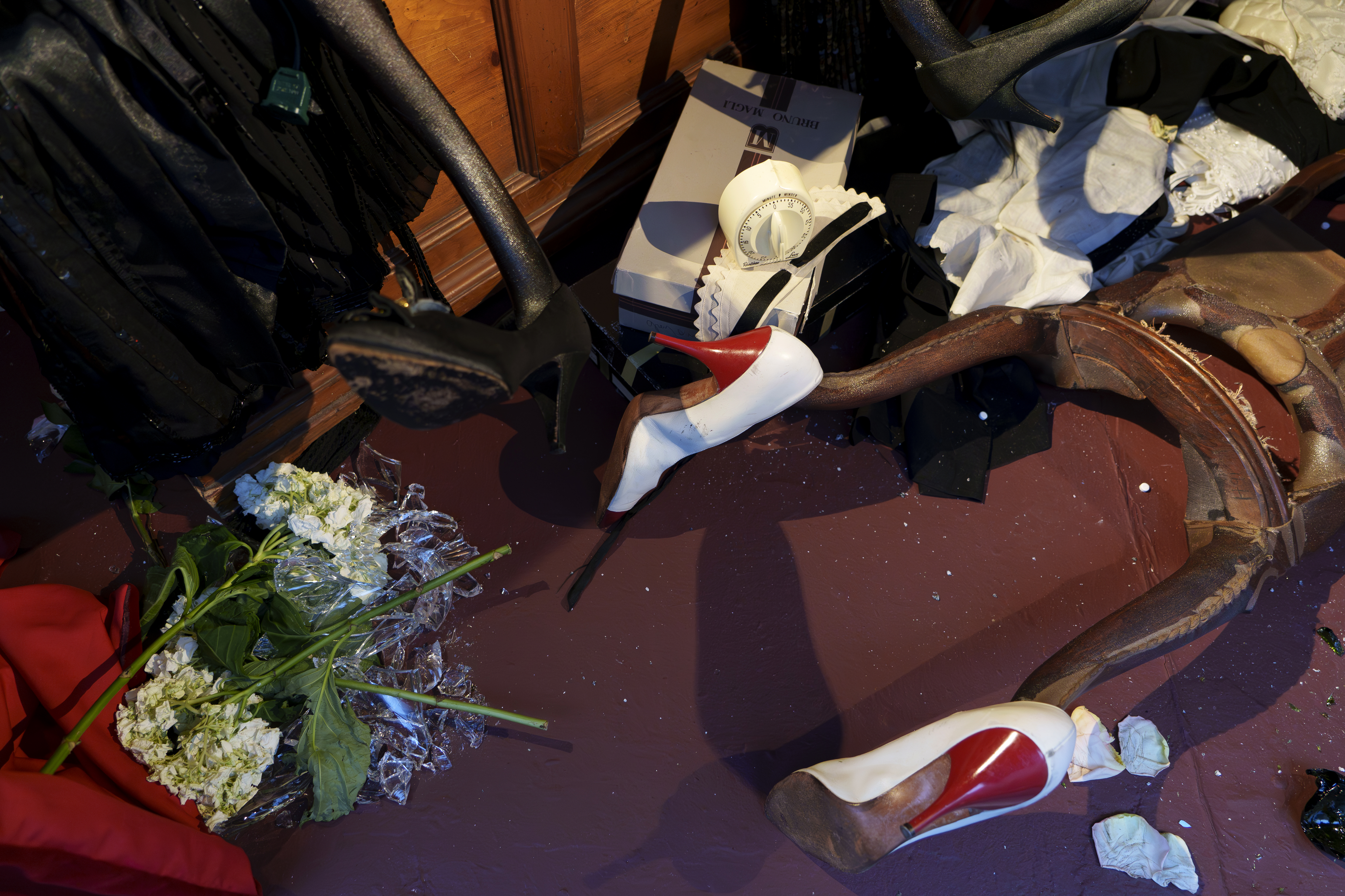 Imposter, 2025, Chair, stockings, resin, shoes, costumes, trunk