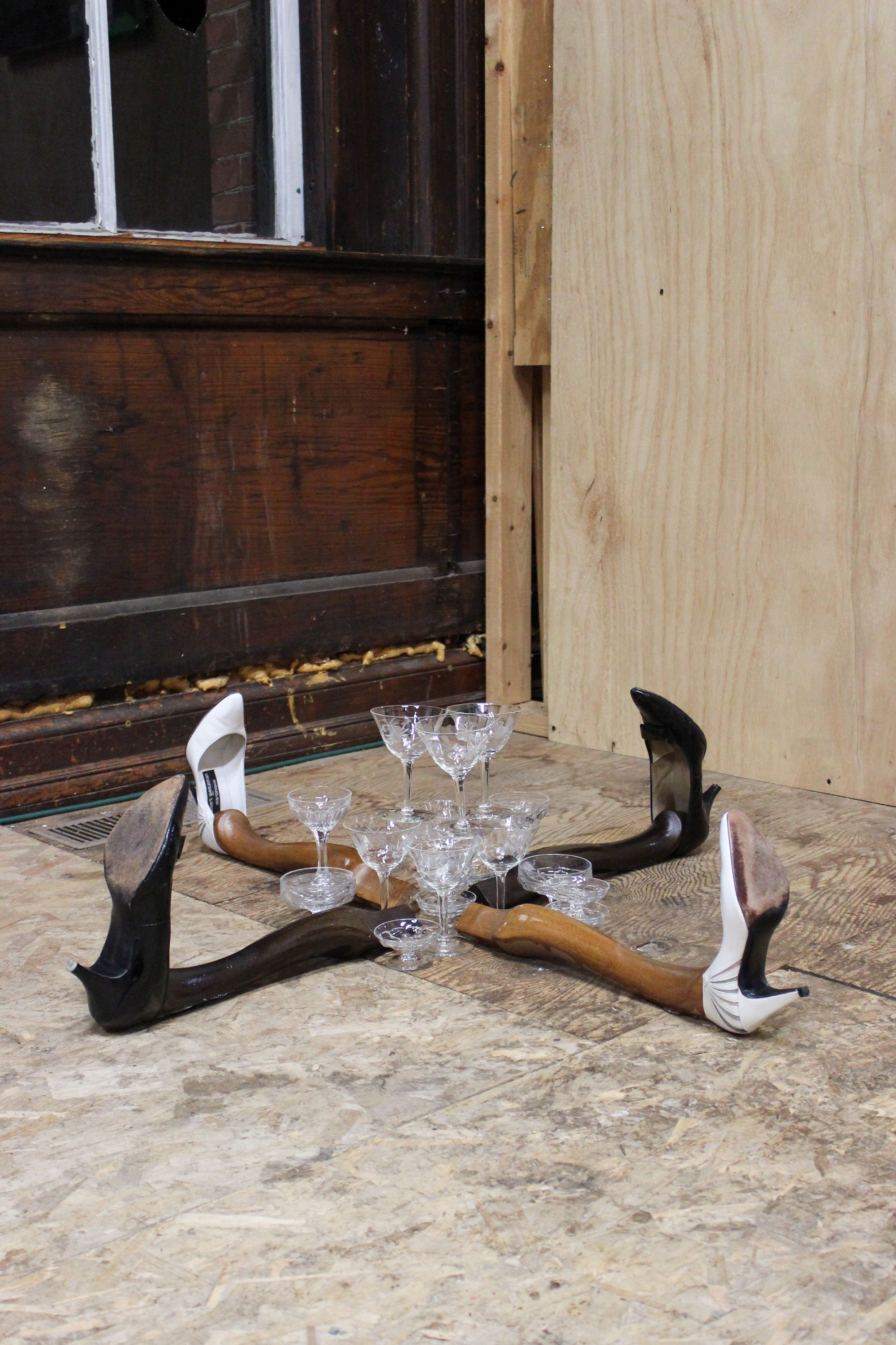 Marcie breaks her neck falling down the stairs, 2024, Chairs, stockings, resin, shoes Who Shot Candy Warhol?, 2024, Spotlight, wig